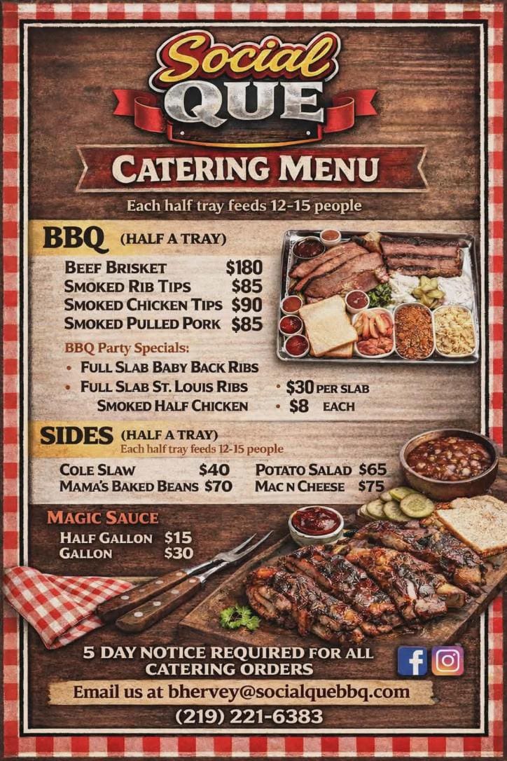Michigan City native, Brealon Hervey, born in 1988 was always surrounded by gatherings and barbeque. With the age of social media during his fitness journey he learned of the smoking style of BBQ from a cousin whom had previously been a chef. Pairing new techniques along with old via his father and a host of uncles, Social Que BBQ and Catering was born. Starting to test the product on the local community in September of 2017, Social Que is now ready to expand and have barbeque be a gateway to open portals of communication.
